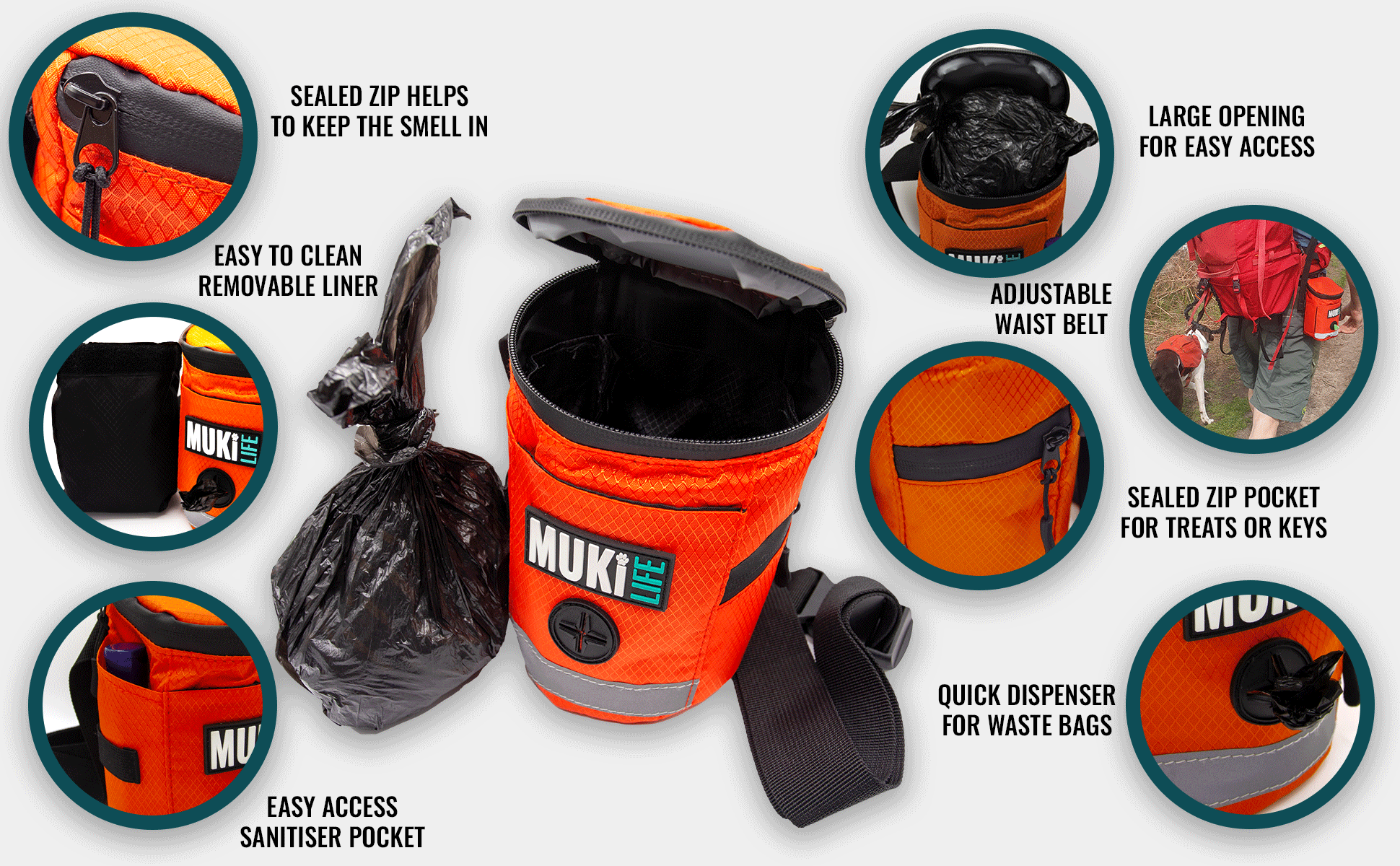 The MUKi Trek Pouch features a removable easy to clean inner lining, built-in dog bag dispenser, extra pockets for sanitiser or any other items you need, and an adjustable stap which can be worn around the waist or over the shoulder.